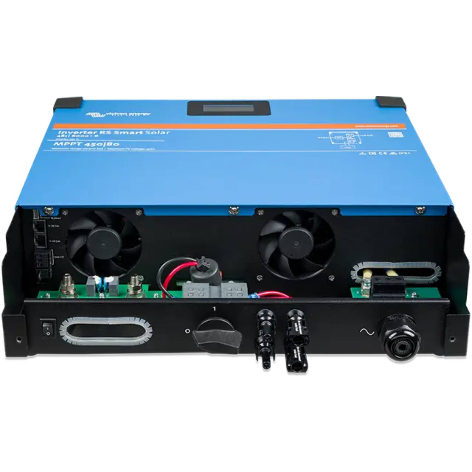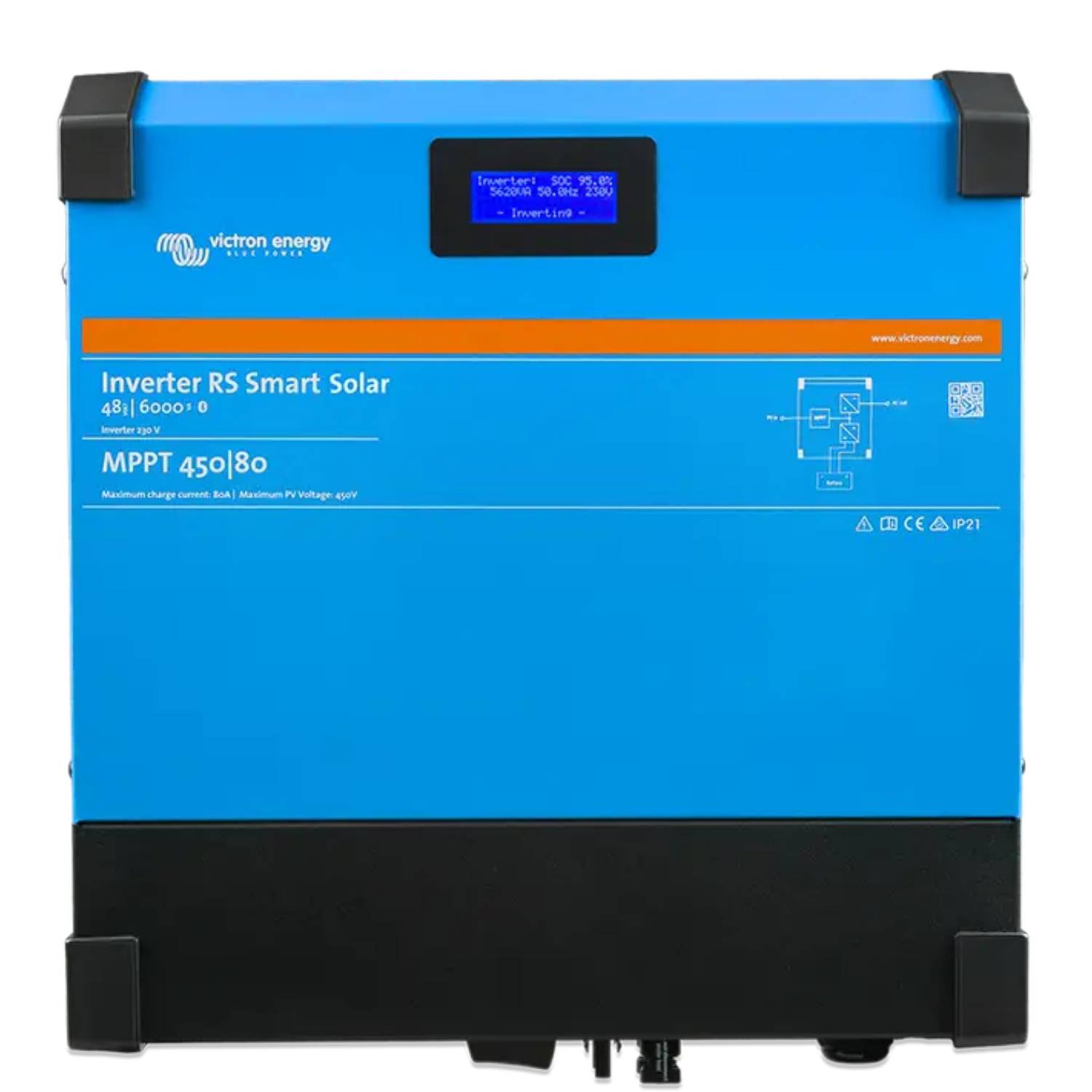 L’Inverter RS Smart Solar è una combinazione di un potente inverter 48 VCC, 6 kVA 230 VCA e un caricatore solare MPPT 4 kW, 80-450 VCC ad alta tensione. Grazie al design del suo modem e alla tecnologia ad alta frequenza, l’inverter pesa solamente 11 kg e possiede un’eccellente efficienza, un bassa potenza di standby e un funzionamento altamente silenzioso.