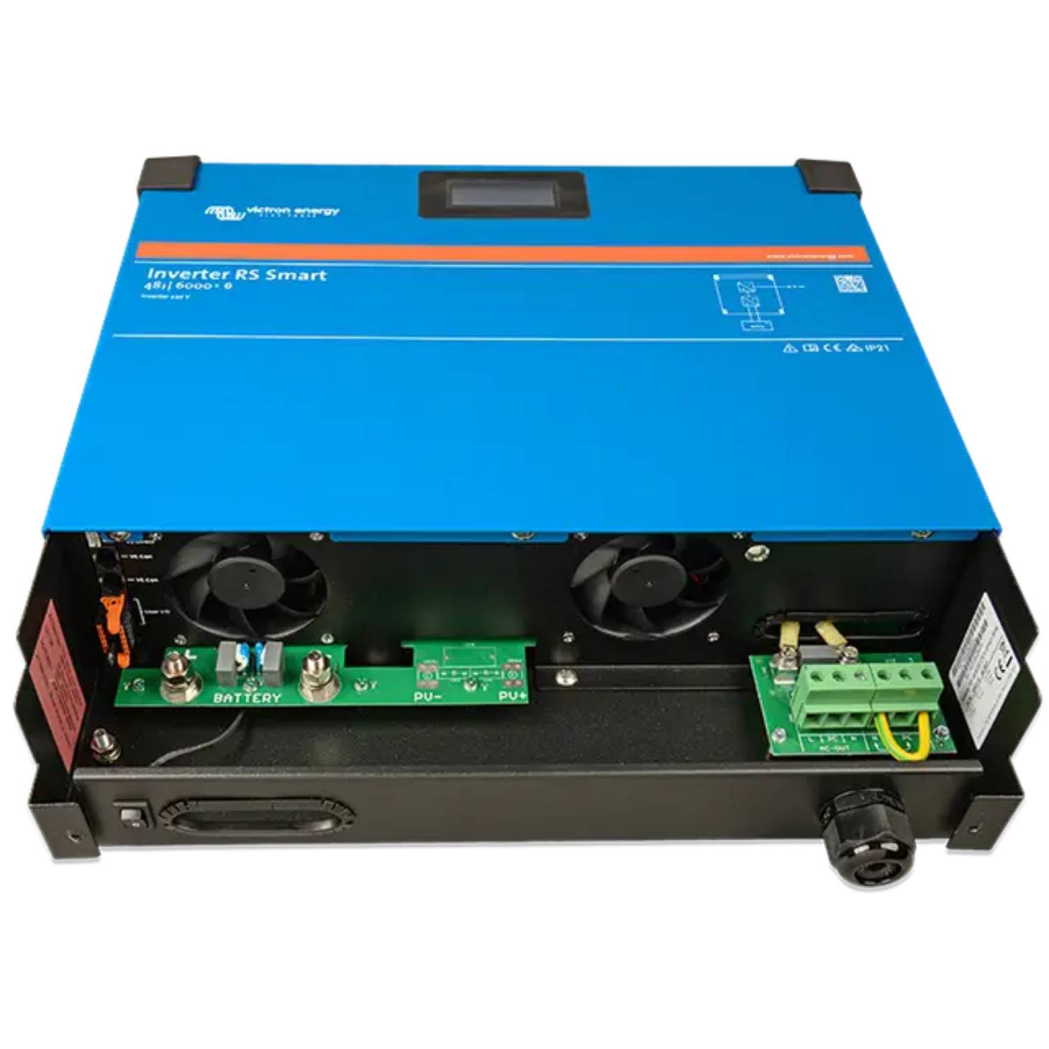 L’Inverter RS Smart è un potente inverter da 48 VCC, 6 kVA 230 VCA. È dotato di un design moderno e di tecnologia ad alta frequenza, pesa solamente 11 kg e possiede un’eccellente efficienza, una bassa potenza di standby e un funzionamento altamente silenzioso.