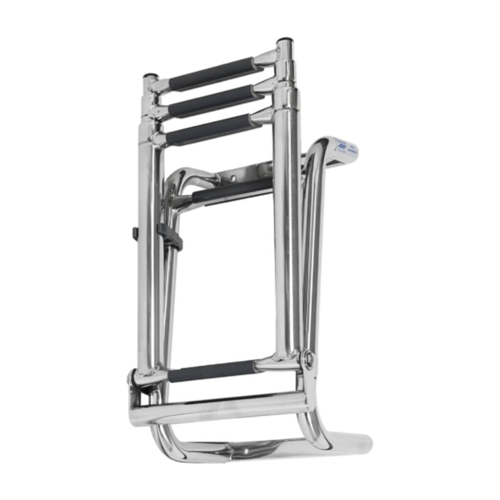 Questa scala è dotata di un telaio che funge anche da comode maniglie ed è leggermente inclinato verso l'esterno per una salita facile e sicura. Include un gradino rotondo sul telaio e quattro gradini piatti e comodi sulla sezione pieghevole. I due gradini inferiori sono telescopici per una lunghezza regolabile. In posizione sollevata, la scala si fissa tramite le clip di plastica incluse sul telaio.